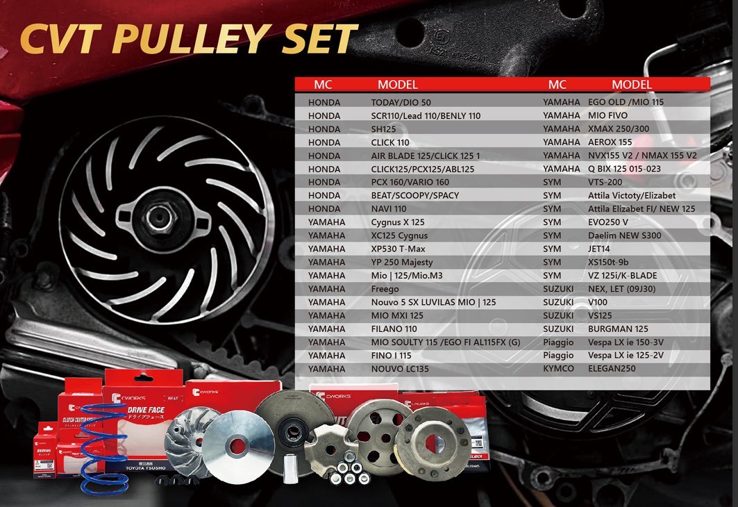 Product Introduction: The transmission is the heart of scooter performance. CWORKS, a premium brand by Toyota Tsusho, offers CVT Pulley Sets engineered for precision and durability. Designed to optimize power delivery and engine response, CWORKS ensures a smoother ride and enhanced acceleration, whether for daily commuting or performance tuning.